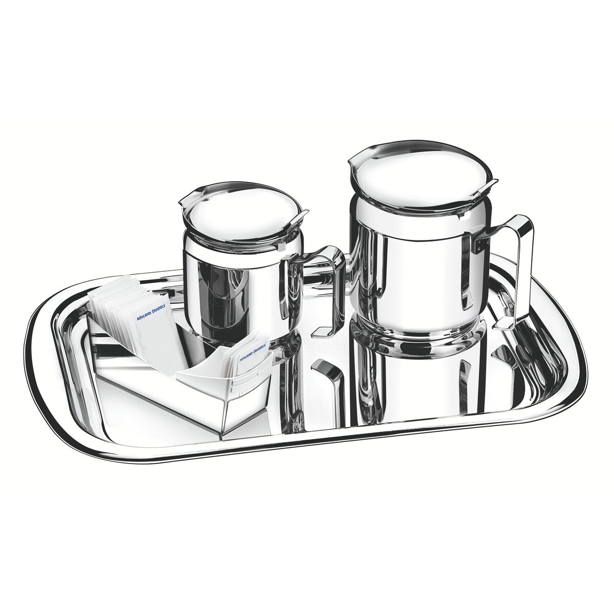 1 61316390 Bandeja retangular + 1 61470100 Bule para café e leite Diâmetro 10cm 0,78l + 1 61470080 Bule para café e leite Diâmetro 8,4cm 0,47l + 1 61531000 Porta-sachês