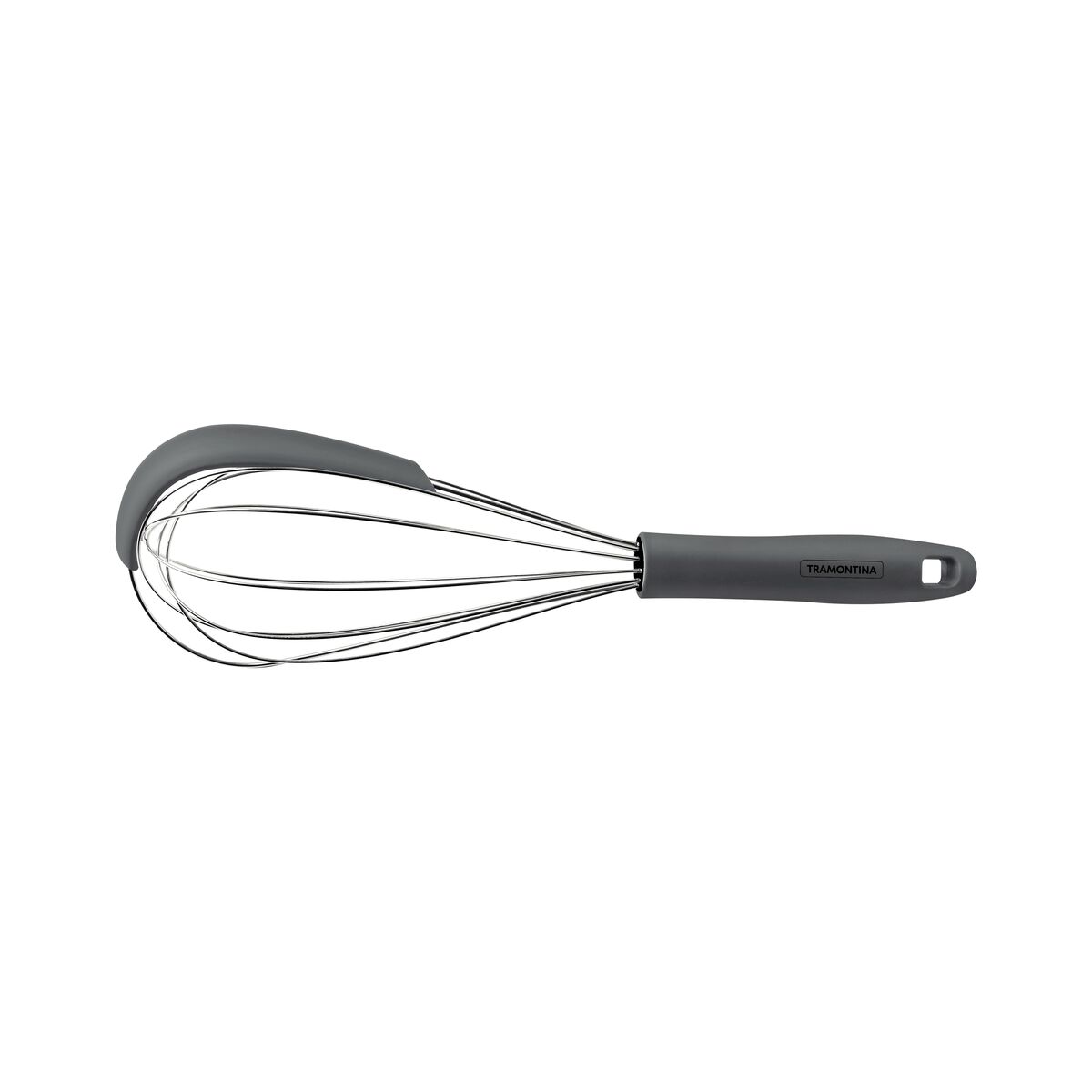 Batedor de aço inox e silicone, que resiste até uma temperatura de 210 °C.
