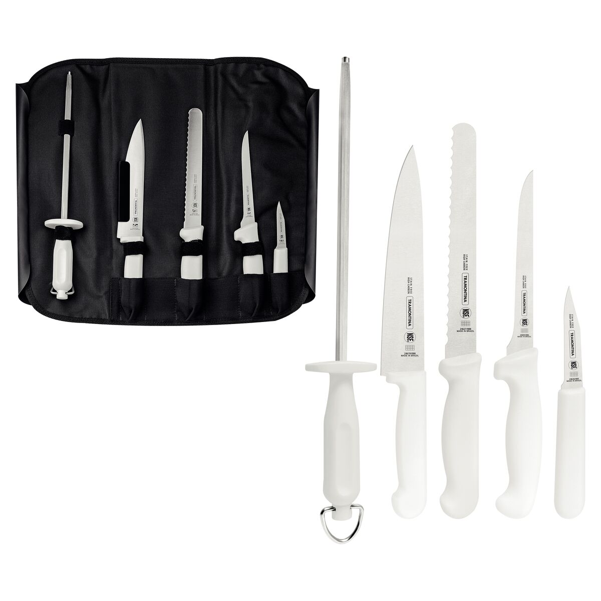 Facas com lâmina em aço inox. Cabo em polipropileno injetado diretamente sobre a espiga da lâmina. Chaira com haste em aço carbono revestida com cromo-duro. Argola em aço inox. Estojo em nylon.
