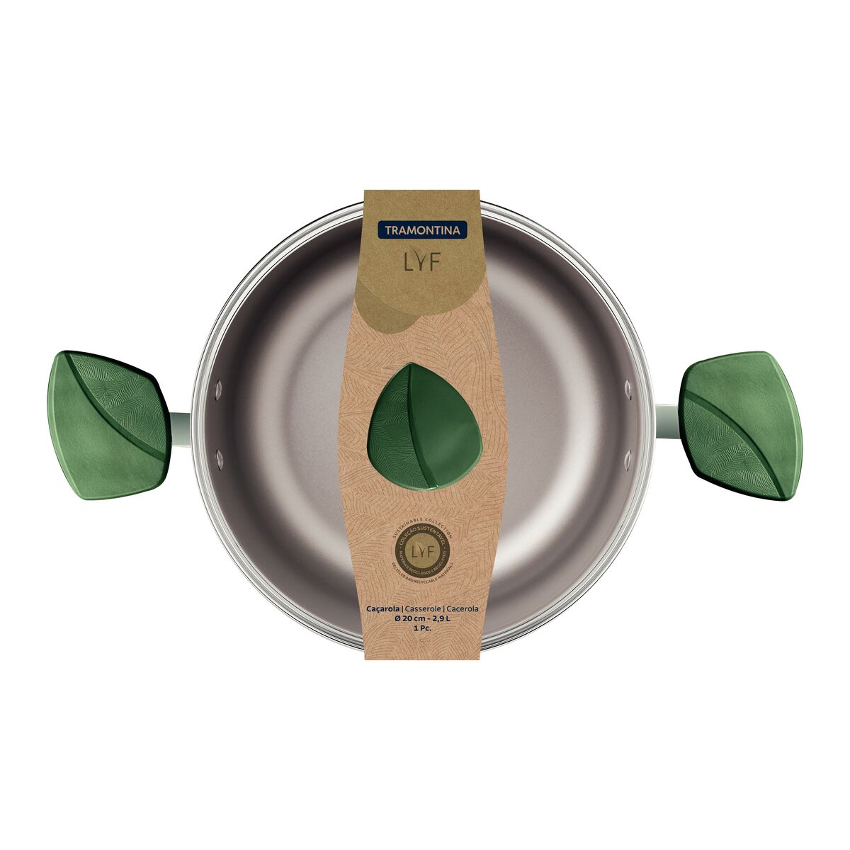 Inspirada em elementos naturais, tais como o vento e a folha, a caçarola Tramontina LYF em alumínio com revestimento interno e externo em antiaderente Starflon Max verde natureza 20 centímetros de diâmetro 2,9 litros proporciona um cozimento rápido e uniforme dos alimentos e um preparo muito mais prático. Desenvolvida com espessura de 1,8 milímetros e revestimento em antiaderente Starflon Max, ela evita que os alimentos grudem na superfície, é muito fácil de limpar e muito mais durável. Suas alças são em termoplástico de engenharia, material 100% reciclado e que garante um manuseio muito mais confortável e seguro. Além de todas essas características, a caçarola ainda vem com tampa de vidro com saída de vapor, borda de aço inox e pegador em nylon. A Tramontina te ajuda a fazer uma escolha ainda mais sustentável, com uma linha de produtos para quem escolhe ter uma cozinha mais sustentável!