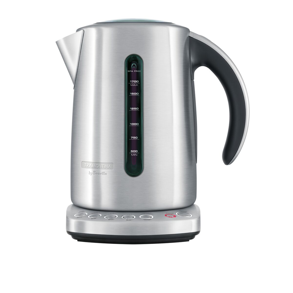 - Chaleira elétrica de aço inox fosco. Produto certificado conforme FALCÃO BAUER OCP 0003 Segurança Compulsório INMETRO. - Com 5 configurações de temperatura para o sabor ideal do seu chá ou café. - Tampa controlada por amortecedor previne que a água espirre. - Filtro de pureza removível para facilitar a limpeza. - Janelas duplas de água. - Capacidade de 1,70 litros / 7 xícaras. - Fervura rápida. - Desligamento automático com proteção de fervura seca. - Alça ergonômica com botão para abertura da tampa. - Botão para manter quente, mantém a temperatura da água aquecida por 20 minutos. - Botão Iniciar/Parar. - Base multidirecional com porta-fio.