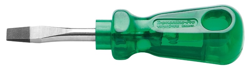 Haste em aço cromo vanádio temperada. Haste curta. Acabamento cromado. Ponta fosfatizada e magnetizada. Cabo em PVC verde transparente. DIN ISO 2380. Ponta chata. As hastes das chaves de fenda são testadas em máquina de ensaio específica, para verificar o perfeito balanço entre resistência mecânica e dureza. Os dimensionais das pontas são verificados com gabaritos-padrão calibrados e certificados, e a qualidade do fosfato é inspecionada ao microscópio. Apertar ou afrouxar parafusos de fenda simples. As ferramentas são produzidas e testadas conforme normas específicas.