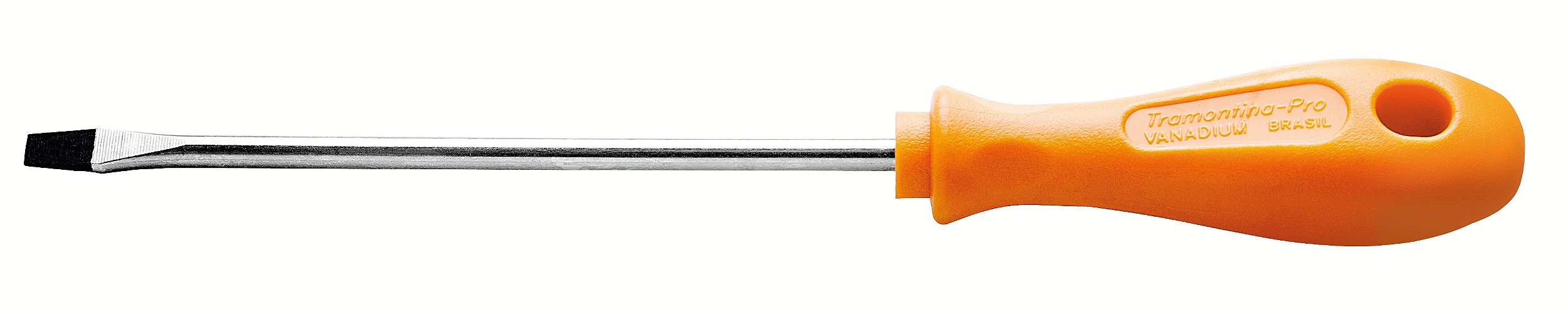 Haste em aço cromo vanádio temperada. Acabamento cromado. Ponta fosfatizada e magnetizada. Cabo injetado. DIN ISO 2380. Ponta chata. As hastes das chaves de fenda são testadas em máquina de ensaio específica, para verificar o perfeito balanço entre resistência mecânica e dureza. Os dimensionais das pontas são verificados com gabaritos-padrão calibrados e certificados, e a qualidade do fosfato é inspecionada ao microscópio. Apertar ou afrouxar parafusos de fenda simples. As ferramentas são produzidas e testadas conforme normas específicas.