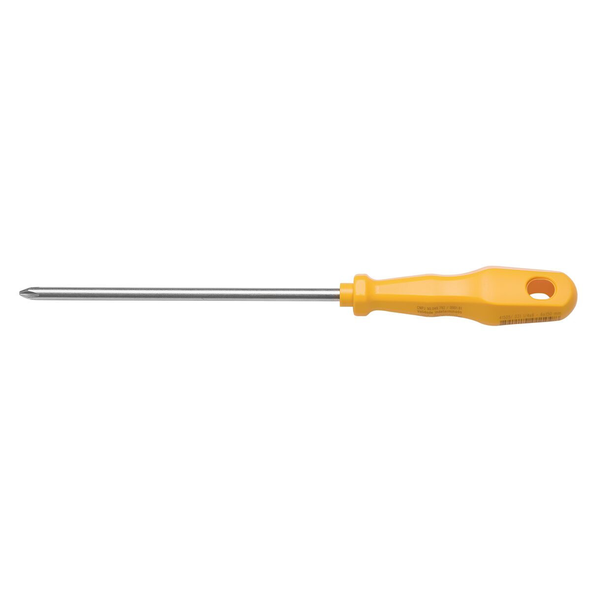 Haste em aço especial temperado. Acabamento niquelado. Ponta cruzada. As hastes as chaves de fenda são testadas em máquinas de ensaio específicas, para verificar o perfeito balanço entre resistência mecânica e dureza. Cabos injetados com material de alta resistência. Os dimensionais das pontas são verificados comgabaritos-padrão, calibrados e certificados. As ferramentas são produzidas e testadas conforme normas específicas.