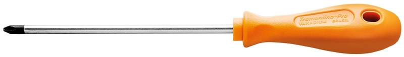 Haste em aço cromo vanádio temperada. Acabamento cromado. Ponta fosfatizada e magnetizada. Cabo injetado. DIN ISO 8764. Ponta cruzada. As hastes das chaves de fenda são testadas em máquina de ensaio específica, para verificar o perfeito balanço entre resistência mecânica e dureza. Os dimensionais das pontas são verificados com gabaritos-padrão calibrados e certificados, e a qualidade do fosfato é inspecionada ao microscópio. Apertar ou afrouxar parafusos de fenda cruzada. As ferramentas são produzidas e testadas conforme normas específicas.