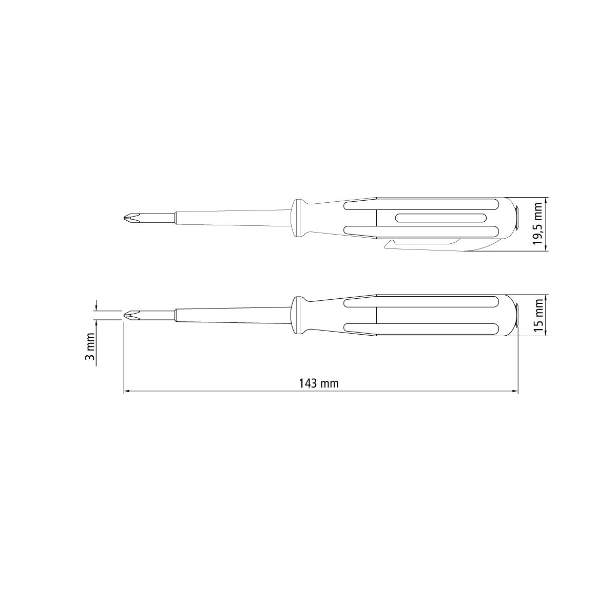 Haste em aço especial temperado. Acabamento niquelado. Circuito elétrico ativado através de botão na extremidade do cabo. Lâmpada de neon. Apropriada para 80 - 250V. As hastes as chaves de fenda são testadas em máquinas de ensaio específicas, para verificar o perfeito balanço entre resistência mecânica e dureza. Cabos injetados com material de alta resistência. Os dimensionais das pontas são verificados comgabaritos-padrão, calibrados e certificados. As ferramentas são produzidas e testadas conforme normas específicas.