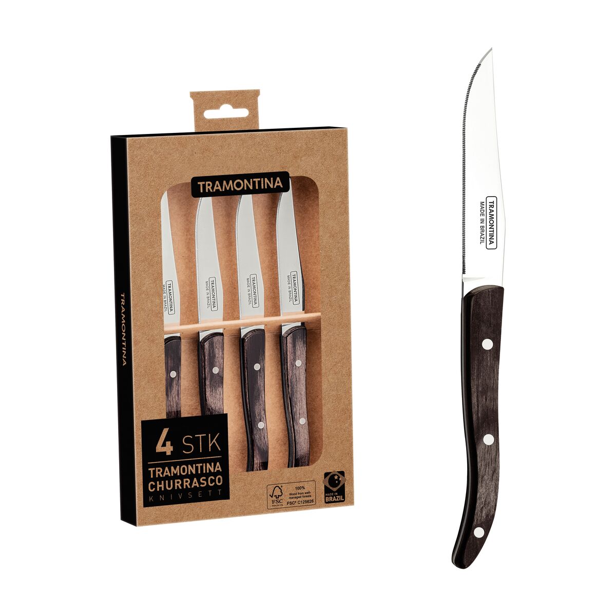 Todo bom churrasqueiro reconhece a importância de uma boa faca. Com o conjunto de facas para Churrasco Tramontina com lâmina em aço inox com cabo castanho polywood 4 Peças sua carne parecerá ainda mais macia e suculenta. Isso porque são produzidas com lâminas de aço inox que proporcionam um excelente corte. E cabos de madeira tratada Polywood, resistentes à impactos e altas temperaturas, e rebites de aço inox. Adicione essa experiência ao seu churrasco e receba muitos elogios.