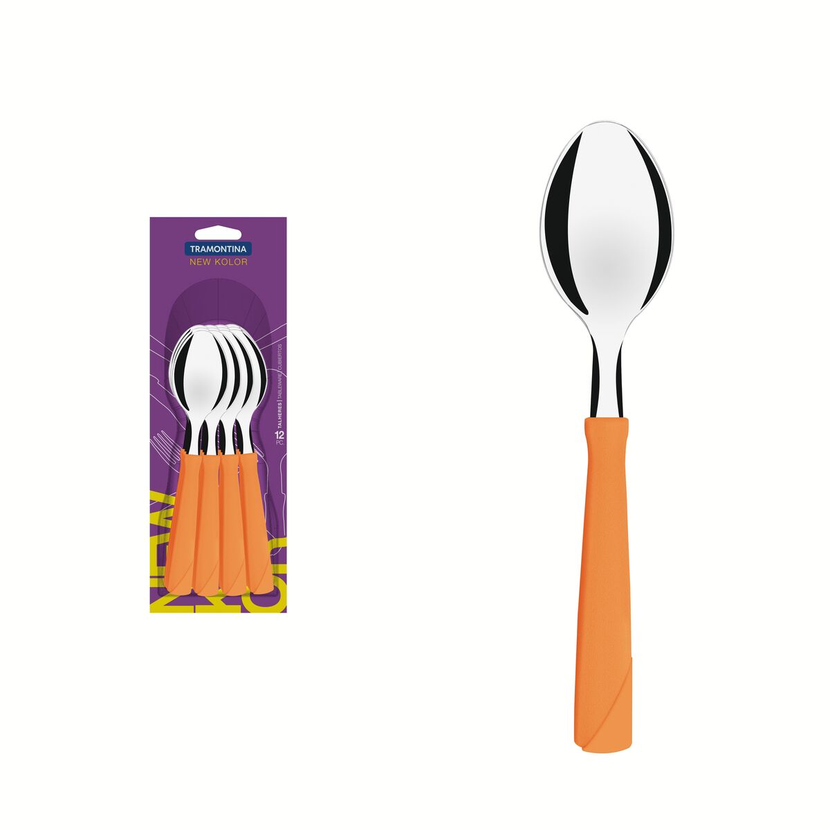 Leve à mesa a alegria das cores. Os talheres da linha New Kolor tem cabos coloridos e resistentes de polipropileno. Com lâminas em aço inox, as colheres têm alta resistência e durabilidade. Todas as peças podem ir à máquina de lavar.