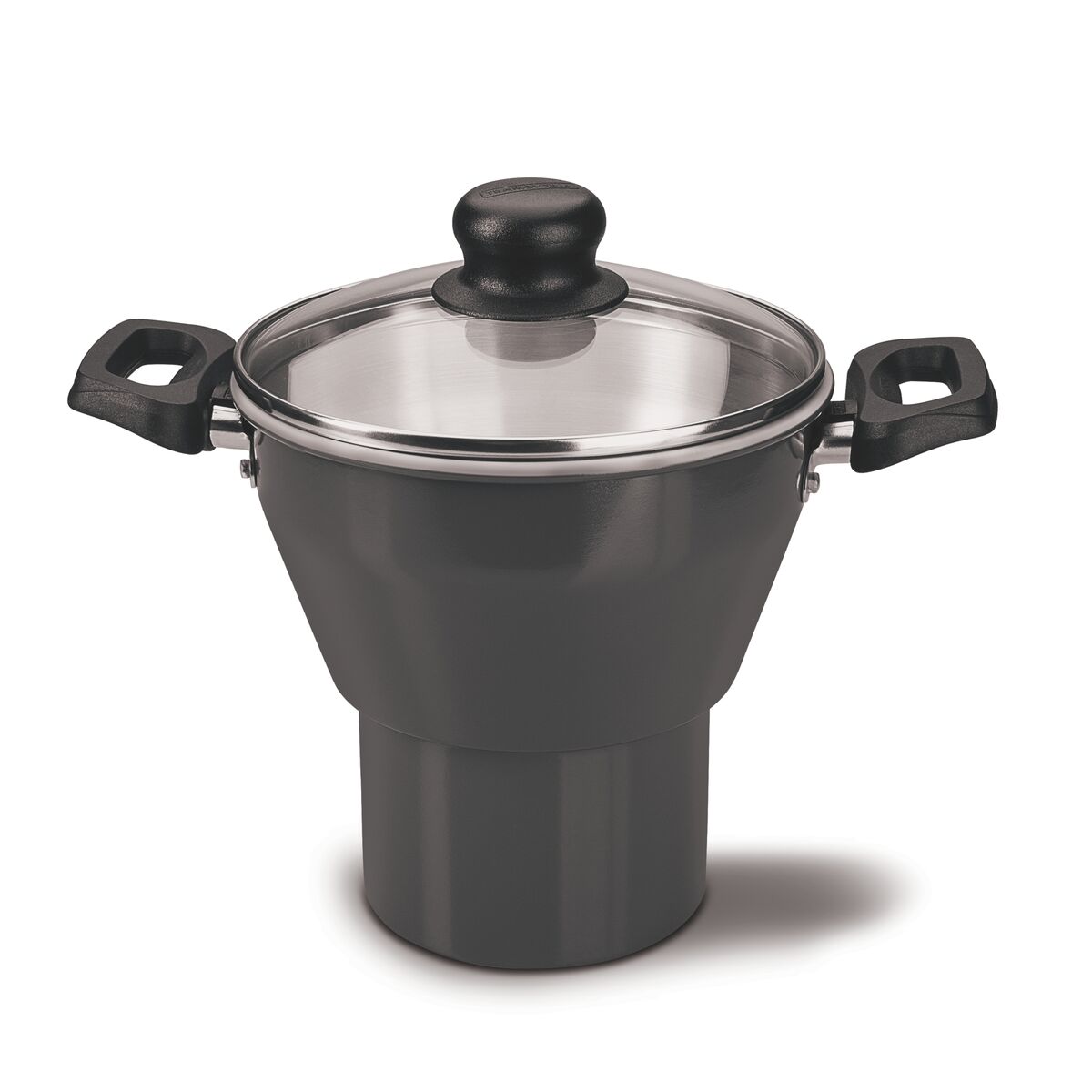 Allumínio com acabamento interno satinado y revestimento externo siliconado. Tampa de vidro temperado. Alças de baquelite antitérmico e pegador de nylon.
