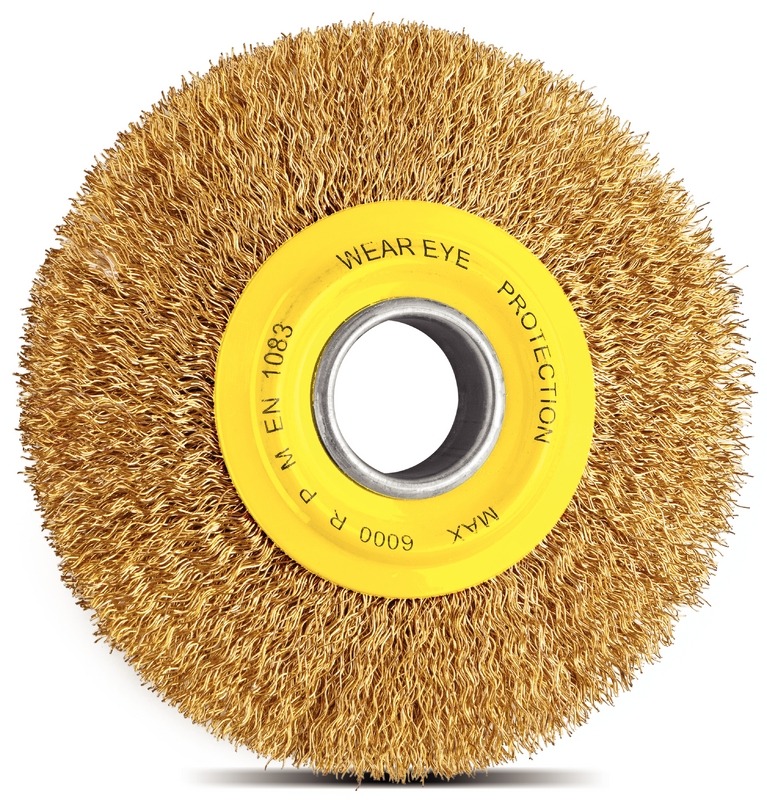 Filamentos em aço latonado temperados. Diâmetro do filamento de 0,3 mm. Adaptadores 1/2", 5/8" e 3/4". EN 1083. Utilizadas nas aplicações de remoção de rebarbas, ferrugem e pintura de nível leve em aços, madeira e borracha. Utilizadas em moto esmeril com rotação até 6000 rpm. As ferramentas são submetidas a testes de aplicação prática para garantir sua resistência mecânica em uso intenso. As ferramentas são produzidas e testadas conforme normas específicas.