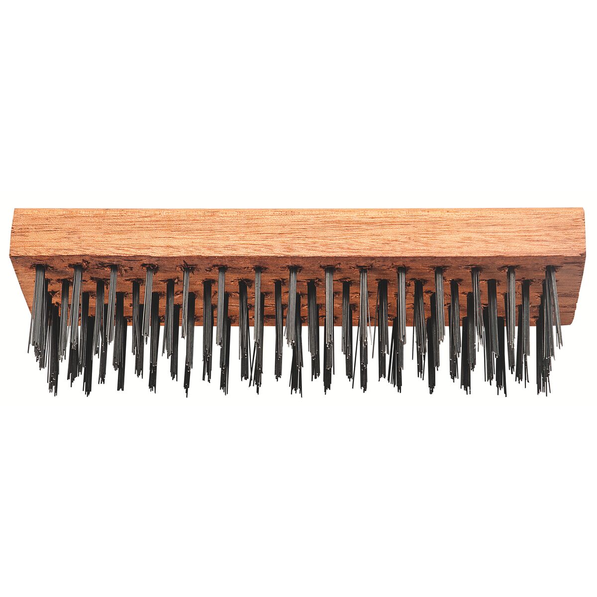 Base em madeira especial. Cerdas produzidas em aço carbono temperado. 5 fileiras de arame. As ferramentas são submetidas a testes de aplicação prática para garantir sua resistência mecânica em uso intenso. Utilizada em trabalhos de limpeza de superfícies em geral As ferramentas são produzidas e testadas conforme normas específicas.