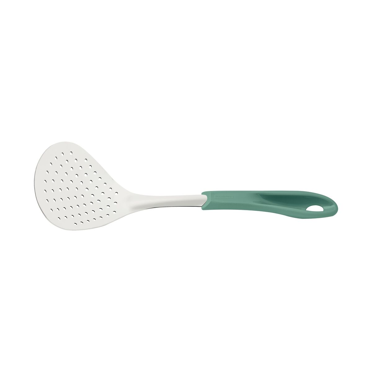 Espumadeira com lâmina de aço inox que proporciona resistência durante o uso.