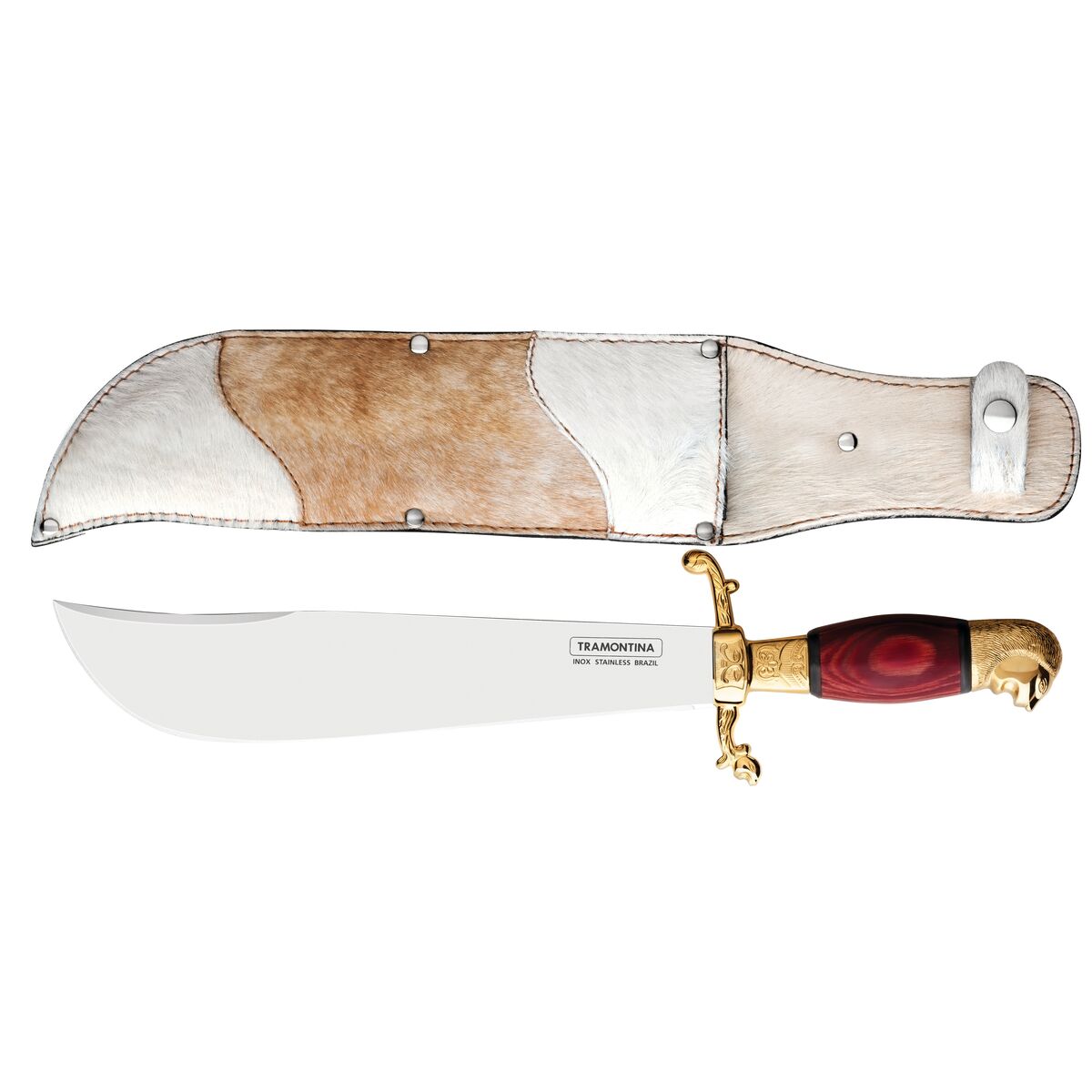 Lâminas em aço inox; Cabos em madeira polywood; Guarnições em zamak, Bainha em couro natural.