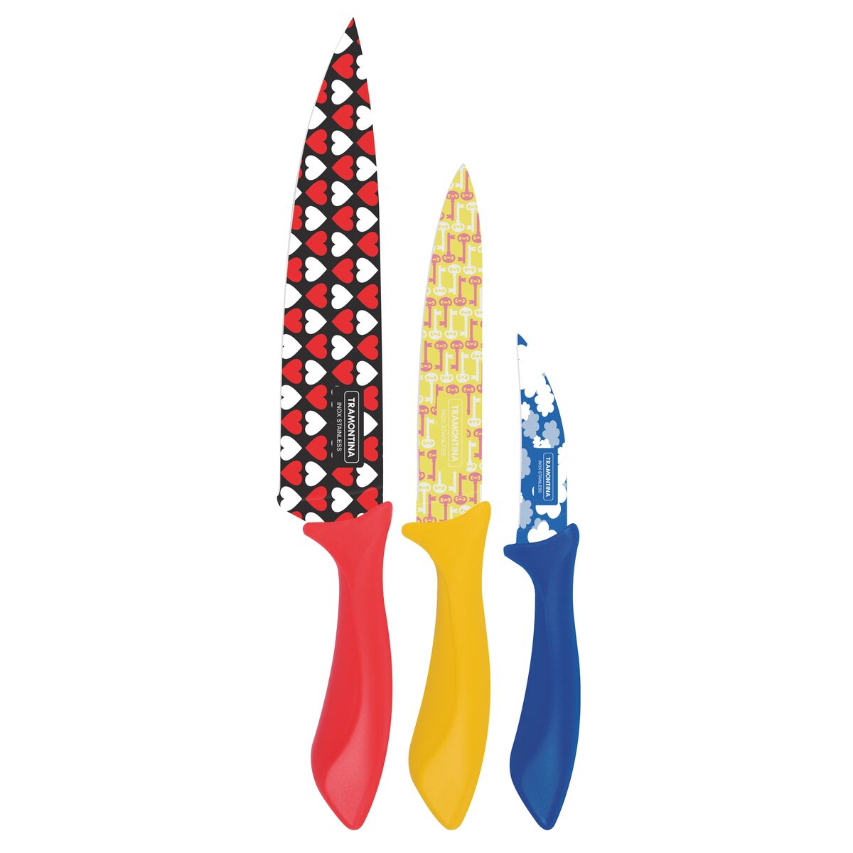 Produtos cortantes e perfurantes: tenha cuidado ao manusear e mantenha-os fora do alcance das crianças. Após cada afiação, remova com cuidado os resíduos que ficarem retidos na lâmina usando um pano seco e macio. Ao guardar ou manusear as facas procure evitar o atrito entre elas ou com outros metais, pois isso poderá ocasionar arranhões e até o desprendimento da pintura. Para a afiação, utilize chaira ou afiador Tramontina. Material atóxico com proteção antimicrobiana. Para maior durabilidade da tonalidade de cores das lâminas, não recomendamos lavar as peças em máquinas de lavar.