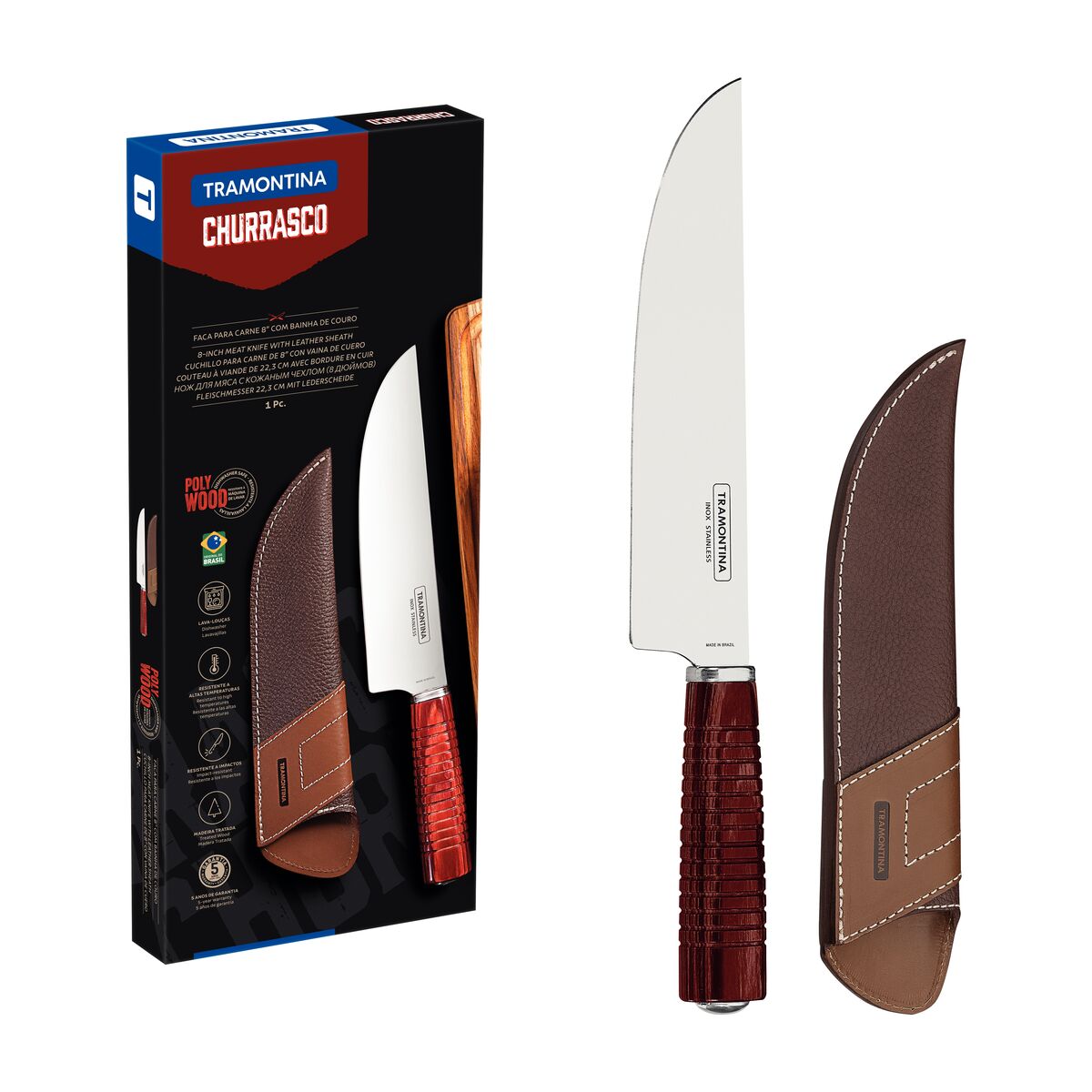 Lâmina de aço inox. Cabo de madeira tratada Polywood. Bainha de couro.