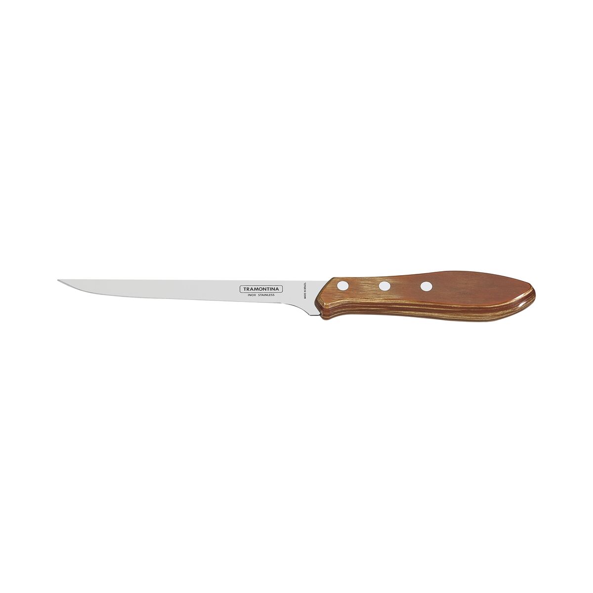 Lâmina de aço inox. Cabo de madeira tratada Polywood. Rebites de alumínio.