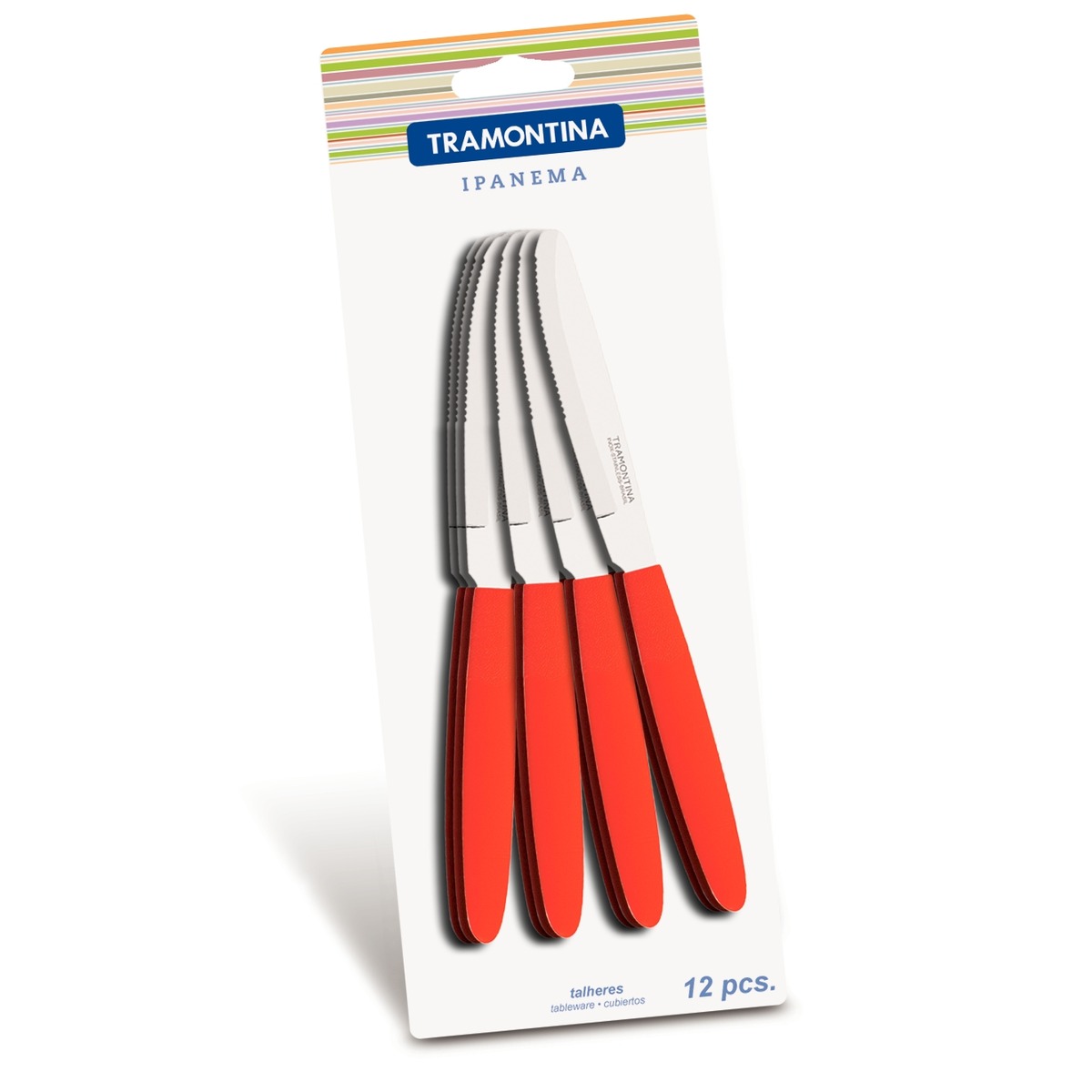 Os talheres da linha Ipanema são próprios para as refeições diárias. Despojados, têm nas diferentes opções de cores dos cabos de polipropileno o toque de alegria que vai à mesa. As facassão de aço inox em espessuras que garantem alta resistência e durabilidade. O formato das lâminas impede deformações e o tratamento térmico dá vida longa ao fio. Podem ser levados à máquina de lavar.