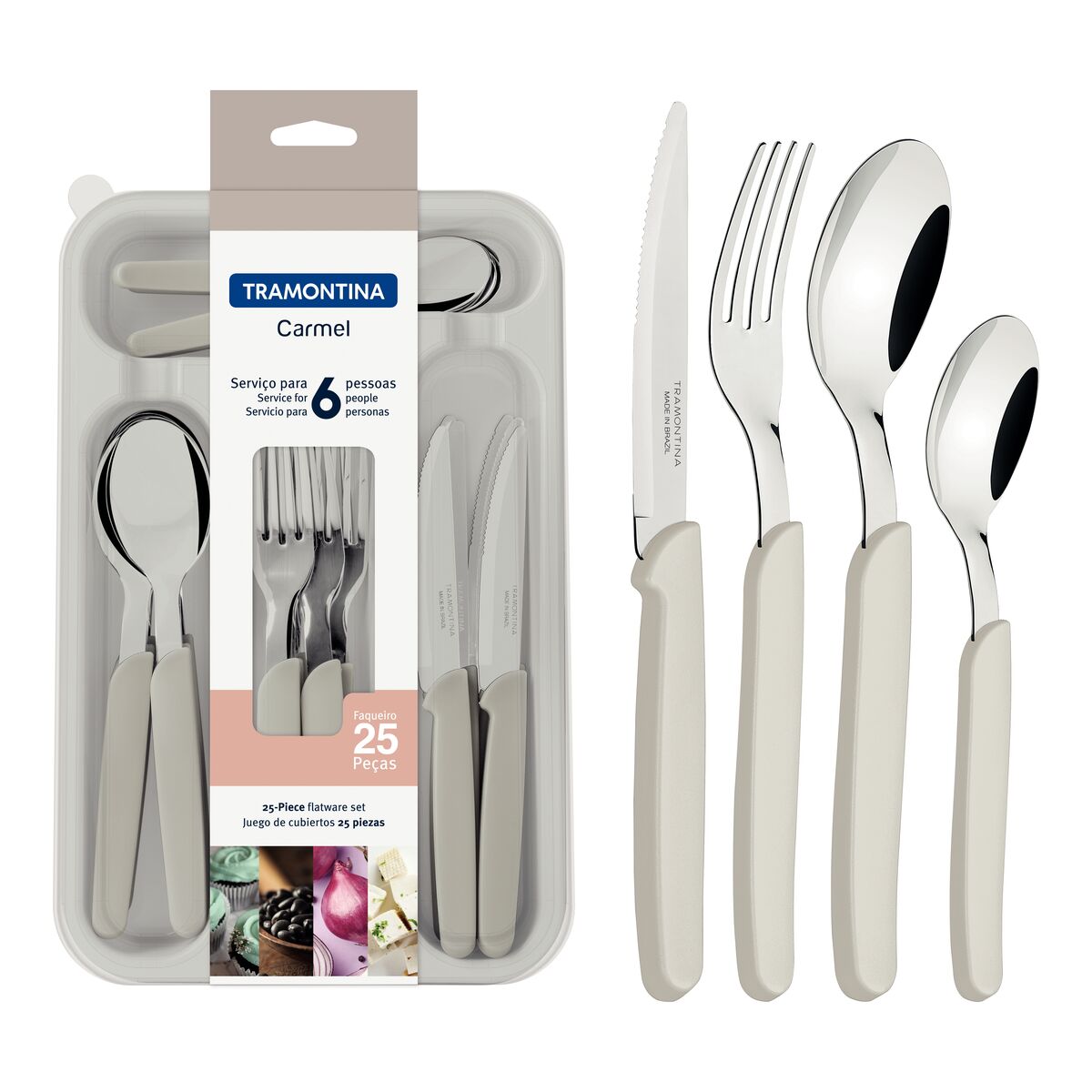 Na hora do almoço ou jantar, os talheres da Linha Carmel dão leveza e alegria ao seu dia a dia! Feitos em aço inox em espessura que mantém formas inalteradas mesmo com uso intenso, os garfos, facas, colheres e colheres de chá têm cabos de polipropileno em diversas opções de cores. O fio das facas tem maior durabilidade, pois as lâminas recebem tratamento térmico. Podem ser levados à máquina de lavar.
