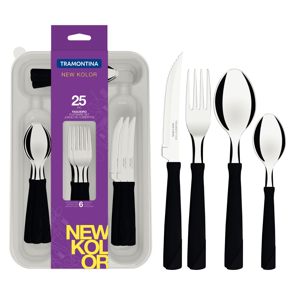 Leve à mesa a alegria das cores. Os talheres da linha New Kolor tem cabos coloridos e resistentes de polipropileno. Com lâminas em aço inox, as facas, os garfos e as colheres têm alta resistência e durabilidade. As lâminas das facas recebem tratamento térmico que lhes garante vida longa ao fio. Todas as peças podem ir à máquina de lavar.