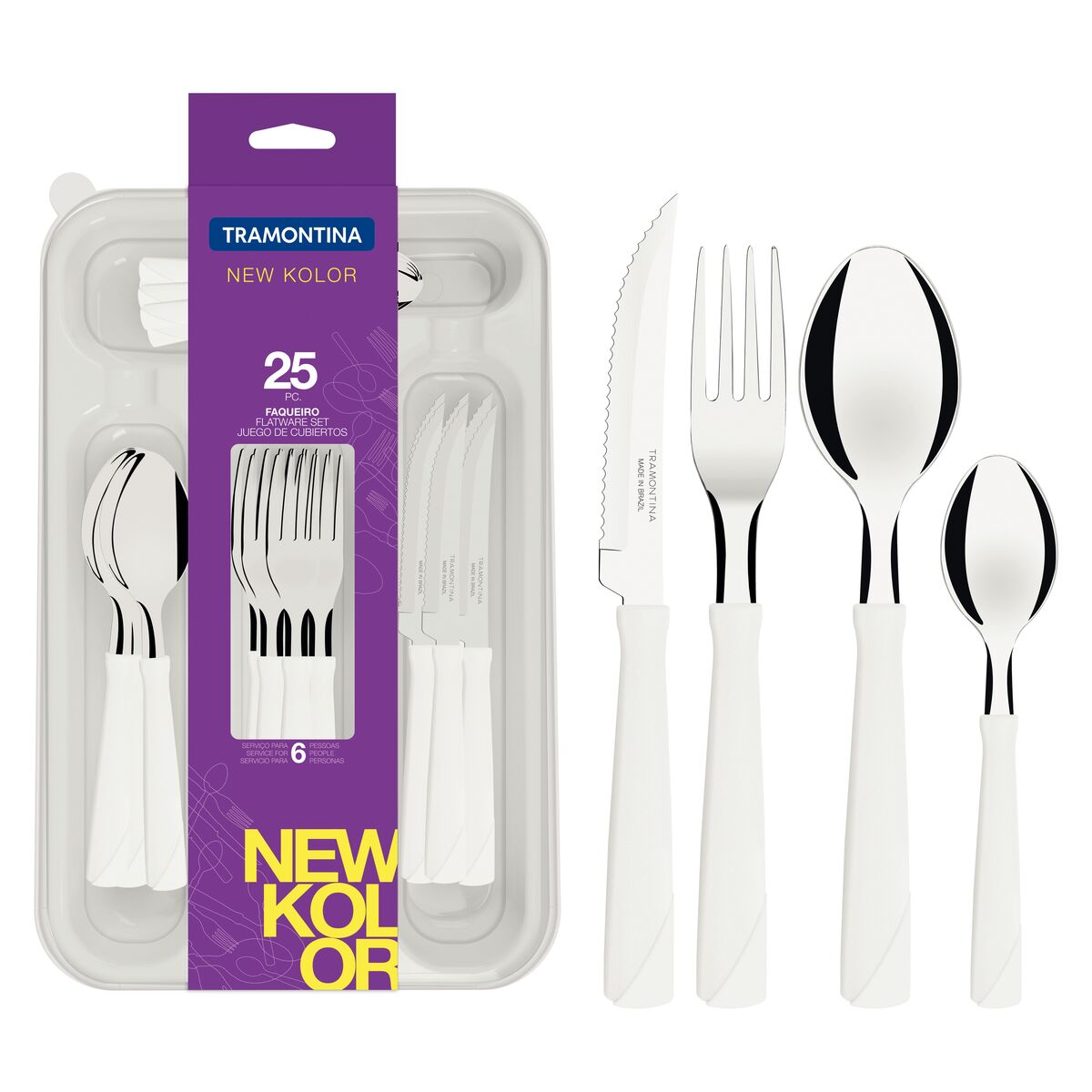 Leve à mesa a alegria das cores. Os talheres da linha New Kolor tem cabos coloridos e resistentes de polipropileno. Com lâminas em aço inox, as facas, os garfos e as colheres têm alta resistência e durabilidade. As lâminas das facas recebem tratamento térmico que lhes garante vida longa ao fio. Todas as peças podem ir à máquina de lavar.