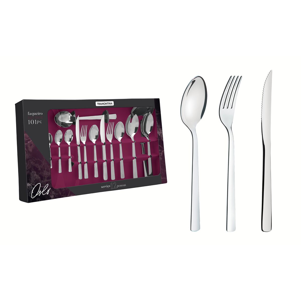 Para um bom churrasco não pode faltar o Faqueiro Tramontina em Aço Inox com Facas para Churrasco Acabamento Brilho 101 Peças da linha Oslo. Um jogo especial feito para quem adora confraternizar em grande estilo. Acompanha colheres com bojo em formato simétrico e bordas cuidadosamente arredondadas. Garfos com dentes polidos na parte interna, com formato apropriado para a boca e bordas arredondadas para proporcionar maior conforto no uso. Facas totalmente temperadas, que garantem maior durabilidade no fio de corte e maior resistência à corrosão, e por suas características de temperabilidade, não riscam as porcelanas. Oferece um serviço para até 12 pessoas. Peças produzidas em aço inox, altamente duráveis, com um acabamento em brilho e belíssimos detalhes no cabo.