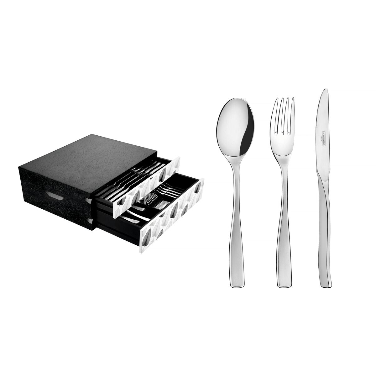 Para você que pretende elevar o ato de receber os amigos para um belo jantar a um patamar mais elegante a Tramontina apresenta o Faqueiro Tramontina em Aço Inox Acabamento Brilho e Estojo de Madeira, da linha Marselha. Todas as 101 peças são produzidas em aço inox, com acabamento brilho, e têm lâminas temperadas que resistem melhor à corrosão e preservam o fio de corte por mais tempo, além de não possuir característica de temperabilidade, garantindo que não haja riscos nas porcelanas. A elegância também fica por conta do belíssimo estojo de madeira, E para aliar praticidade à beleza, ainda podem ser lavadas diariamente na máquina de lavar louças.