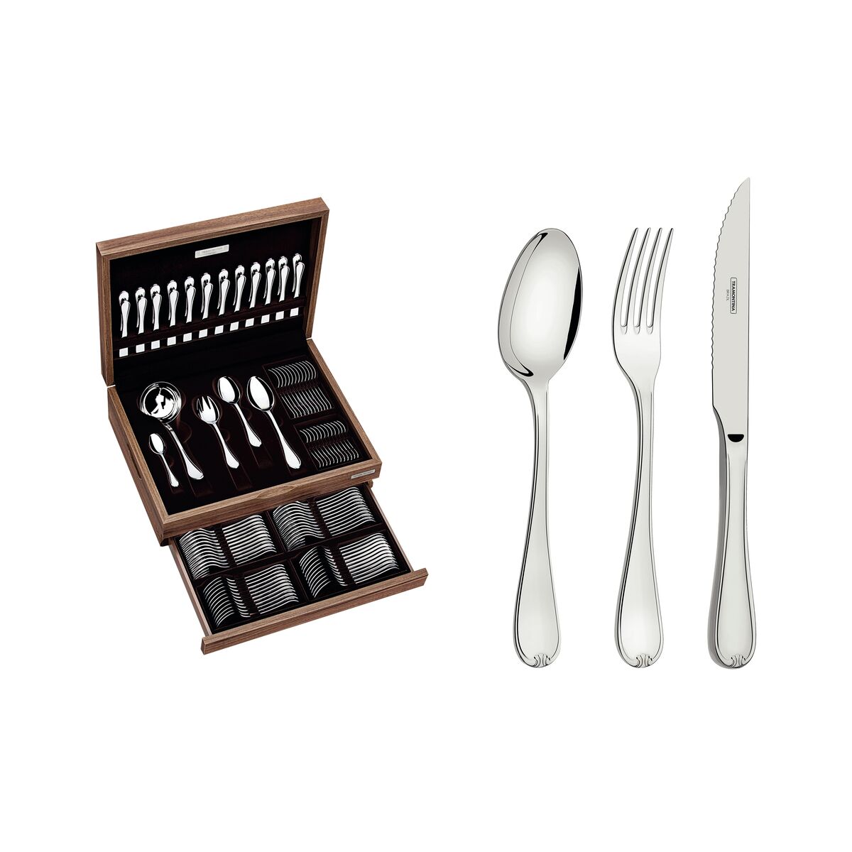 Com o Faqueiro Tramontina em Aço Inox com Facas de Churrasco Forjadas Acabamento Alto Brilho com Detalhes no Cabo e Estojo de Madeira com Compartimento Retrátil 101 Peças da linha Vicenza, a sua mesa irá se destacar. Produzidos em aço inox e altamente durável, mantém suas características originais, preservando a beleza por mais tempo. Seus garfos contam com dentes polidos na parte interna, com formato apropriado para a boca e bordas arredondadas para proporcionar maior conforto no uso. Facas com lâminas temperadas, que garante maior durabilidade no fio de corte serrilhado e maior resistência à corrosão, e por sua característica de temperabilidade, não riscam as porcelanas. Colheres com bojo em formato simétrico e bordas cuidadosamente arredondas. Para trazer mais beleza para a mesa, conta com um alto brilho e detalhes exclusivos no cabo. Seu estojo em madeira MDF pode ser incluído na decoração do ambiente, além de manter os talheres cuidadosamente armazenados.