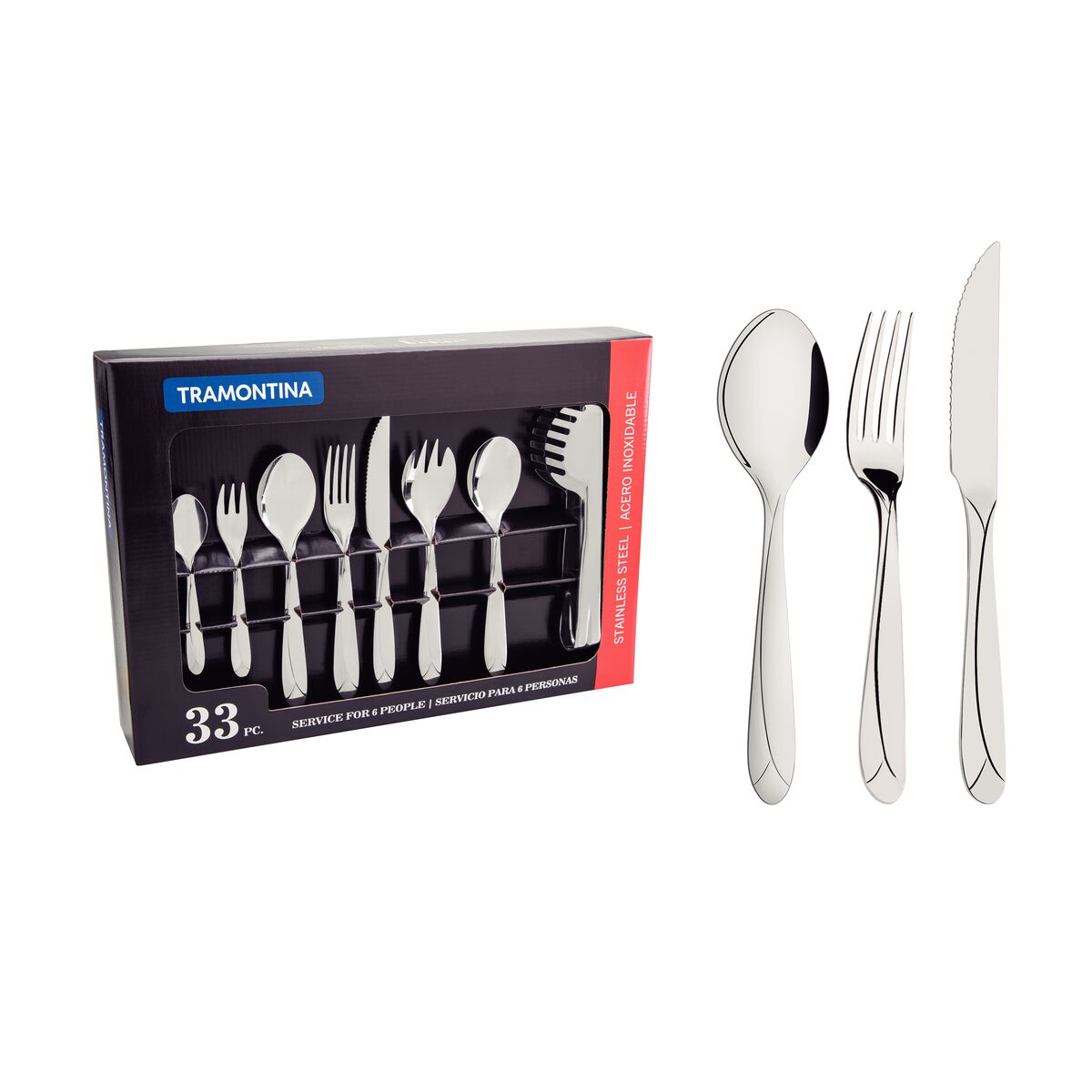 O Faqueiro Tramontina Aurora em Aço Inox com Facas para Churrasco Acabamento em Brilho 33 Peças atende as necessidades na hora de servir. São 33 peças essenciais para uma boa apresentação à mesa e para uso diário. Produzidos totalmente em aço inox, os talheres são altamente duráveis e cheios de estilo. Apresentam acabamento em brilho que embeleza sua mesa. No faqueiro você encontra garfos com dentes polidos na parte interna com formato apropriado para a boca e bordas arredondadas para proporcionar maior conforto no uso. Colheres com bojo apresentam formato simétrico e bordas cuidadosamente arredondadas. E facas totalmente temperadas, garantindo maior durabilidade no fio de corte e maior resistência à corrosão. Além disso, por suas características de temperabilidade elas não riscam as porcelanas. As peças são ainda fáceis de limpar, podendo ser lavadas diariamente na máquina de lavar louças. Um faqueiro perfeito que garante toda a qualidade dos produtos Tramontina!