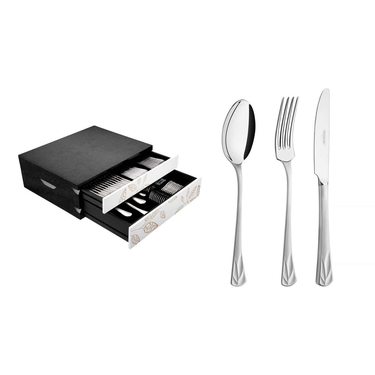 O discreto relevo no cabo lembrando folhas é a marca do design das peças deste faqueiro, acondicionadas em um bonito estojo de madeira.