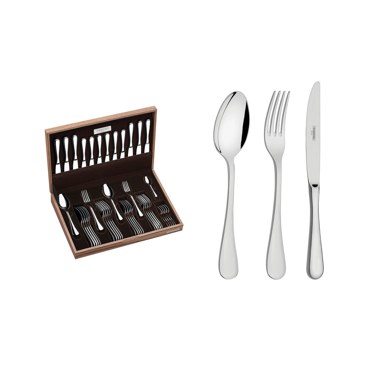 O Faqueiro Tramontina em Aço Inox com Facas Forjadas Acabamento Brilho e Estojo de Madeira 42 Peças da linha Classic, levam para a sua mesa um design único e belo, proporcionando ainda mais sofisticação para o serviço. O jogo acompanha colheres com bojo em formato simétrico e bordas cuidadosamente arredondadas. Garfos com dentes polidos na parte interna, com formato apropriado para a boca e bordas arredondadas para proporcionar maior conforto no uso. Facas com lâminas temperadas, que garante maior durabilidade no fio de corte serrilhado e maior resistência à corrosão, e por sua característica de temperabilidade, não riscam as porcelanas. Cada talher é produzido em aço inox, altamente durável e com um acabamento em alto brilho sofisticado e diferenciado. Para acompanhar as peças são acondicionadas em um belíssimo estojo de madeira MDF, que permite um armazenamento cuidados, além de poder ser incluído na decoração de qualquer ambiente.