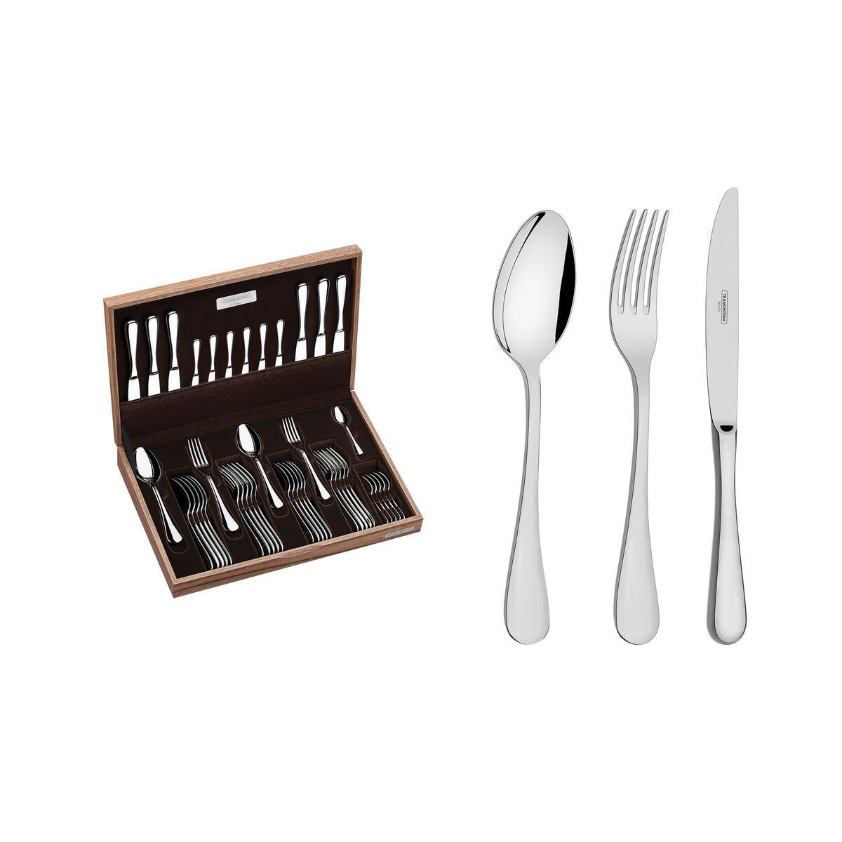 O Faqueiro Tramontina em Aço Inox com Facas de Mesa Forjadas Acabamento Brilho e Estojo de Madeira 42 Peças da linha Classic, é a opção ideal para deixar a sua mesa ainda mais encantadora. O jogo conta com colheres com bojo em formato simétrico e bordas cuidadosamente arredondadas. Garfos com dentes polidos na parte interna, com formato apropriado para a boca e bordas arredondadas para proporcionar maior conforto no uso. Facas totalmente temperadas, que garantem maior durabilidade no fio de corte serrilhado e maior resistência à corrosão, e por suas características de temperabilidade, não riscam as porcelanas. Seu acabamento em alto brilho trará para o ambiente uma sofisticação única. As peças foram desenvolvidas totalmente em aço inox, garantindo uma excelente durabilidade, que mantém as suas características originais por muito mais tempo. O detalhe fica pelo estojo de madeira MDF, que pode ser incluído na decoração.