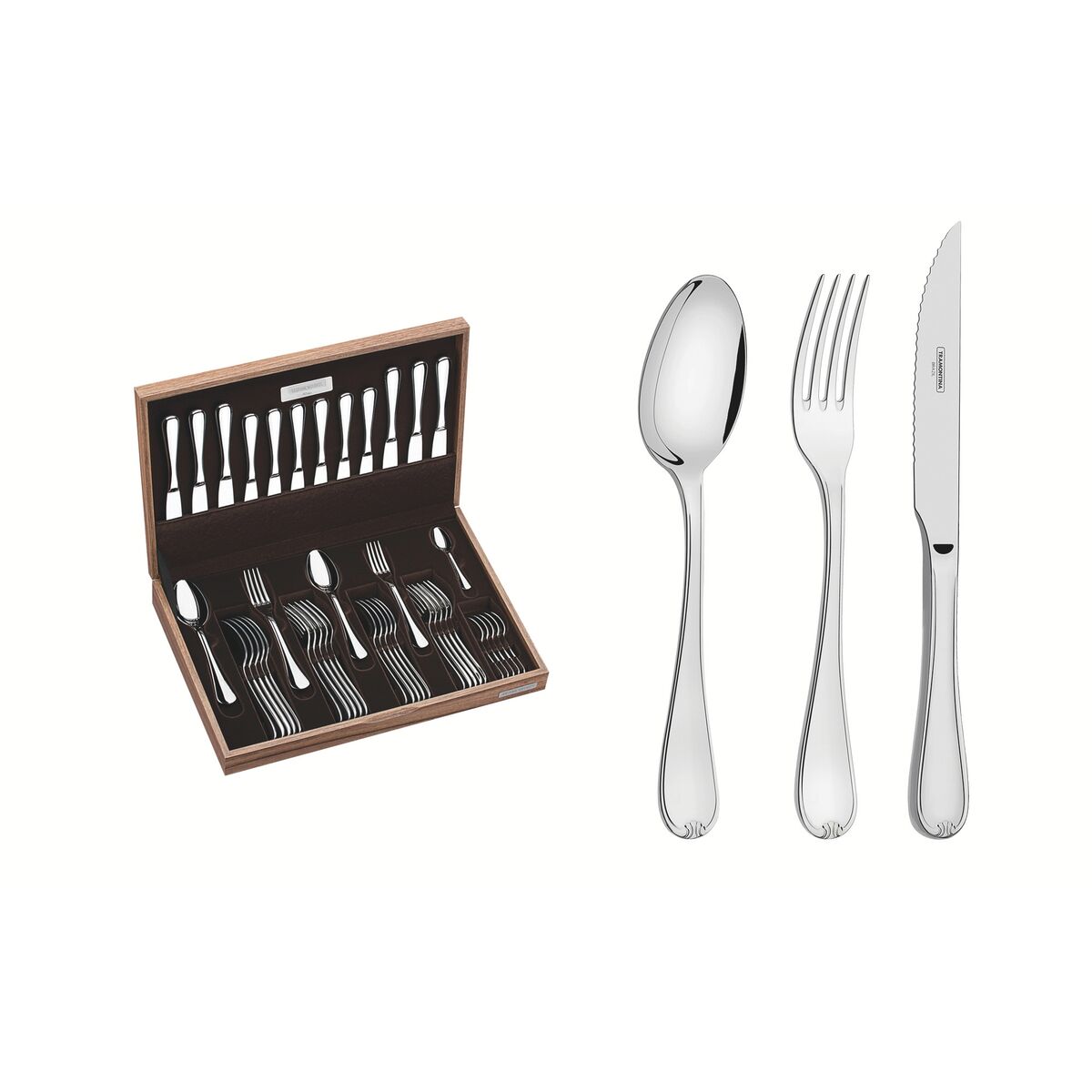 O Faqueiro Tramontina em Aço Inox com Faqueiro Tramontina Vicenza em Aço Inox com Facas para Churrasco Forjadas Acabamento Alto Brilho 42 Peças, trazem um brilho e um design diferenciado para a mesa. As peças são produzidas em aço inox, que proporciona alta durabilidade, mantendo suas características originais por muito mais tempo, além de contar com um acabamento em alto brilho e detalhes no cabo. Garfos com dentes polidos na parte interna, com formato apropriado para a boca e bordas arredondadas para proporcionar maior conforto no uso. Facas com lâminas temperadas, que garante maior durabilidade no fio de corte serrilhado e maior resistência à corrosão, e por sua característica de temperabilidade, não riscam as porcelanas. Colheres com bojo em formato simétrico e bordas cuidadosamente arredondadas. Com seu estojo em madeira MDF e compartimento retrátil é possível armazenar os talheres com cuidado e utilizá-lo na decoração do ambiente.