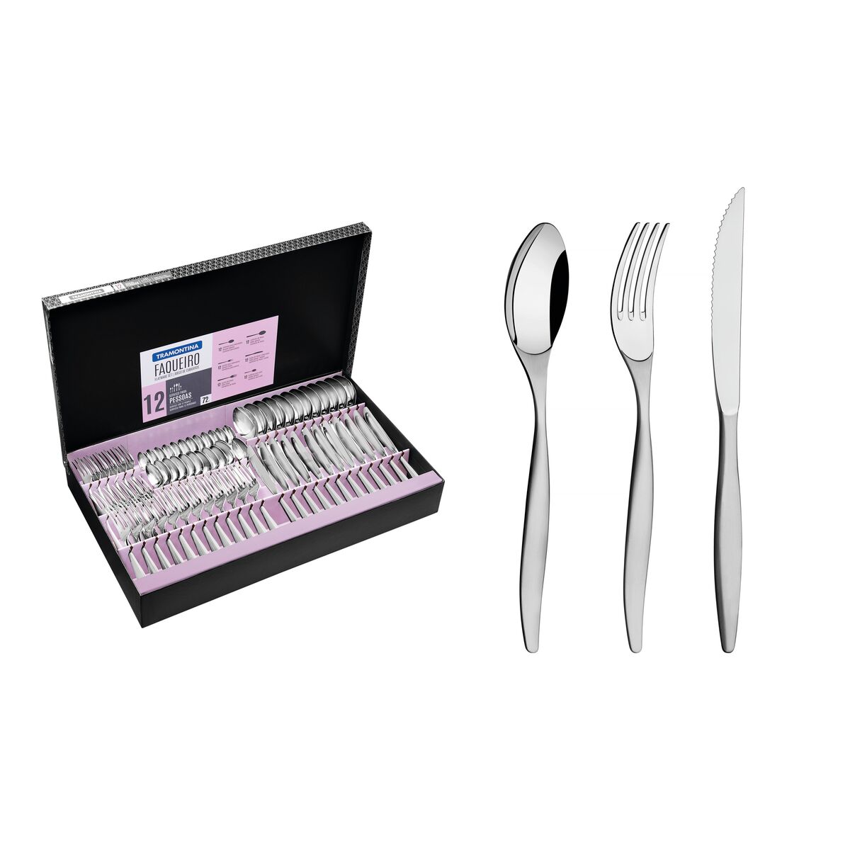 Churrasco sem uma boa faca não dá certo. Com o Faqueiro Tramontina em Aço Inox com Facas para Churrasco Acabamento Brilho e Fosco 72 Peças da linha Wind, você tem as mais belas peças em sua mesa, sem deixar de lado toda sua funcionalidade. Além de contar com a oportunidade de saborear um delicioso churrasco com muito estilo. O faqueiro conta com colheres com bojo em formato simétrico e bordas cuidadosamente arredondadas. Garfos com dentes polidos na parte interna, com formato apropriado para a boca e bordas arredondadas para proporcionar maior conforto no uso. Facas de fio serrilhado totalmente temperadas, que garantem maior durabilidade no fio de corte e maior resistência à corrosão, e por suas características de temperabilidade, não riscam as porcelanas. Com esse faqueiro você pode servir até 12 pessoas. Conta com belíssimo acabamento em fosco e brilho.