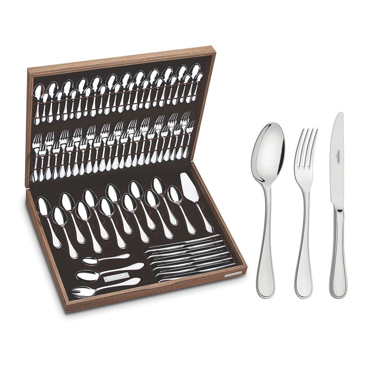 O Faqueiro Tramontina em Aço Inox com Facas de Mesa Forjadas Acabamento Brilho e Estojo de Madeira 76 Peças da linha Firenze, foi feito para quem busca peças de qualidade e sem deixar de lado a sofisticação. O faqueiro conta com colheres com bojo em formato simétrico e bordas cuidadosamente arredondadas. Garfos com dentes polidos na parte interna, com formato apropriado para a boca e bordas arredondadas para proporcionar maior conforto no uso. Facas com lâminas temperadas, que garante maior durabilidade no fio de corte serrilhado e maior resistência à corrosão, e por sua característica de temperabilidade, não riscam as porcelanas. Os talhares são produzidos em aço inox, proporcionando alto brilho e durabilidade para as peças. Seu estojo em madeira MDF garante um armazenamento cuidadoso, além de poder ser incluído na decoração, levando beleza para qualquer ambiente.