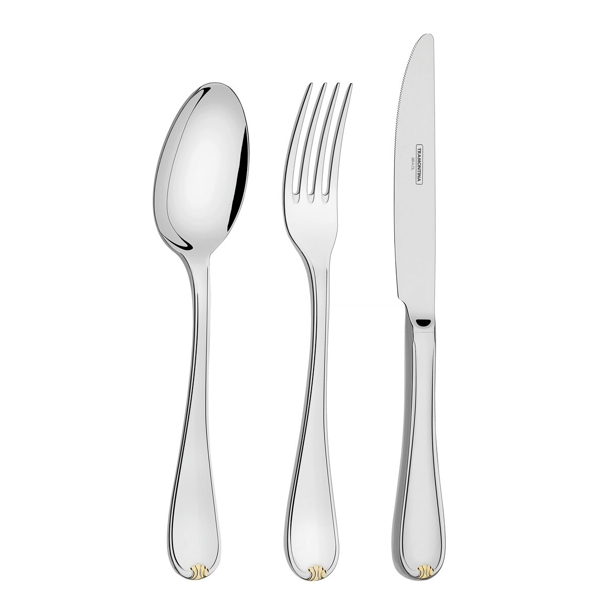 De aço inoxidável, com detalhes em ouro 24 quilates, altamente duráveis, mantém as características originais, preservando a beleza, a higiene e a durabilidade do material.
