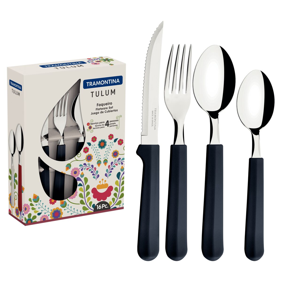 O Faqueiro Tramontina Tulum com Lâminas em Aço Inox e Cabos de Polipropileno Onix 16 peças vai deixar sua cozinha ainda mais bonitas com talheres modernos. São 16 peças ideais para auxiliar você a servir quatro pessoas. Com cabos de polipropileno na cor onix, elas levam mais conforto e bom gosto à sua mesa. As facas são produzidas com lâmina em aço inox, garantindo maior resistência e durabilidade do fio de corte. Os garfos e colheres garantem maior resistência devido a espessura do aço e a estampagem das lâminas. São produtos fáceis de limpar e podem ser levados à máquina de lavar louças.