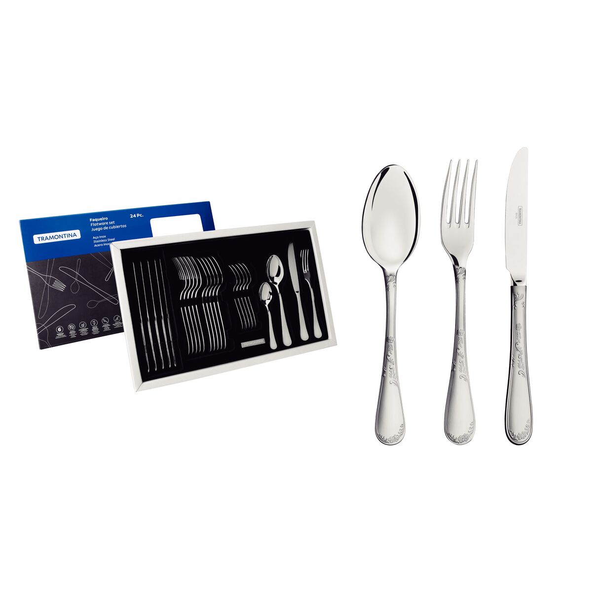 O belíssimo Faqueiro Tramontina em Aço Inox Acabamento Brilho e Fosco com Detalhes em Alto Relevo no Cabo 24 Peças da linha Renascença, conta com um acabamento único em fosco e brilho, proporcionando ainda mais beleza para a sua mesa. As peças foram produzidas totalmente em aço inox, altamente duráveis, o que mantém as características originais por mais tempo. O jogo oferece um serviço básico para mesa e conta com facas com cabo oco e lâminas temperadas, proporcionando resistência à corrosão e durabilidade no fio de corte serrilhado e por sua característica de temperabilidade não riscam as porcelanas.