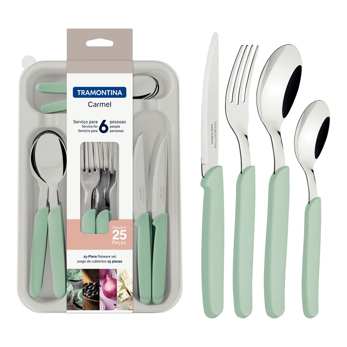 Na hora do almoço ou jantar, os talheres da Linha Carmel dão leveza e alegria ao seu dia a dia! Feitos em aço inox em espessura que mantém formas inalteradas mesmo com uso intenso, os garfos, facas, colheres e colheres de chá têm cabos de polipropileno em diversas opções de cores. O fio das facas tem maior durabilidade, pois as lâminas recebem tratamento térmico. Podem ser levados à máquina de lavar.
