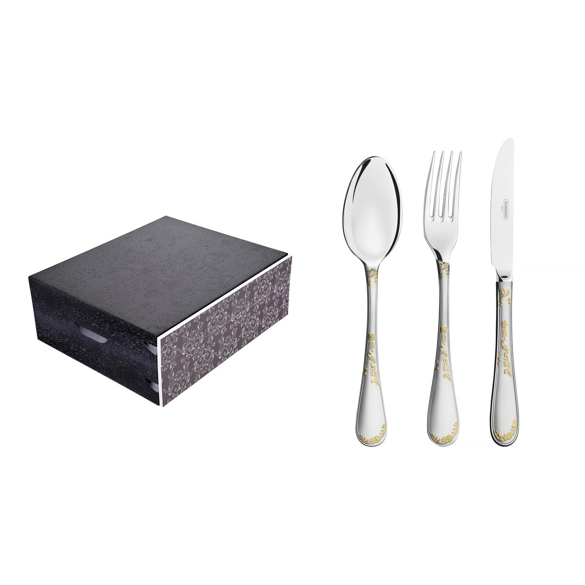 De aço inoxidável, com detalhes em ouro 24 quilates, altamente duráveis, mantém as características originais, preservando a beleza, a higiene e a durabilidade do material.