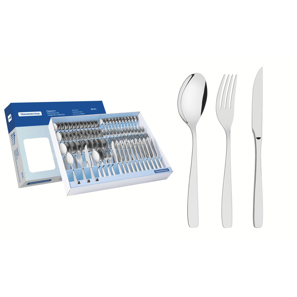12 63950017 Colher de mesa + 12 63950290 Colher média + 12 63950087 Colher para café + 12 63950077 Colher para chá + 12 63950187 Faca para churrasco + 12 63950027 Garfo de mesa + 12 63950140 Garfo para torta