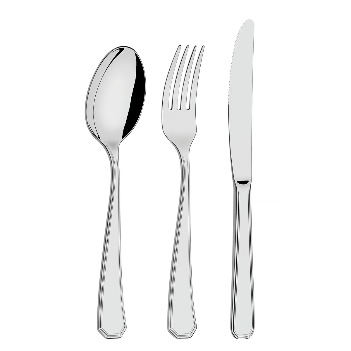 12 63912010 Colher de mesa + 1 63912100 Colher para arroz + 12 63912080 Colher para café + 12 63912070 Colher para chá + 12 63912040 Colher para sobremesa + 1 63912210 Concha para molho + 1 63912090 Concha terrina + 12 63912830 Faca de mesa forjada + 12 63912260 Faca para peixe + 12 63912860 Faca para sobremesa forjada + 12 63912020 Garfo de mesa + 12 63912250 Garfo para peixe + 12 63912050 Garfo para sobremesa + 1 63912110 Pá para açúcar + 2 63912120 Talheres para salada + 2 63912170 Talheres trinchante para carne + 2 63912270 Talheres trinchante para peixe