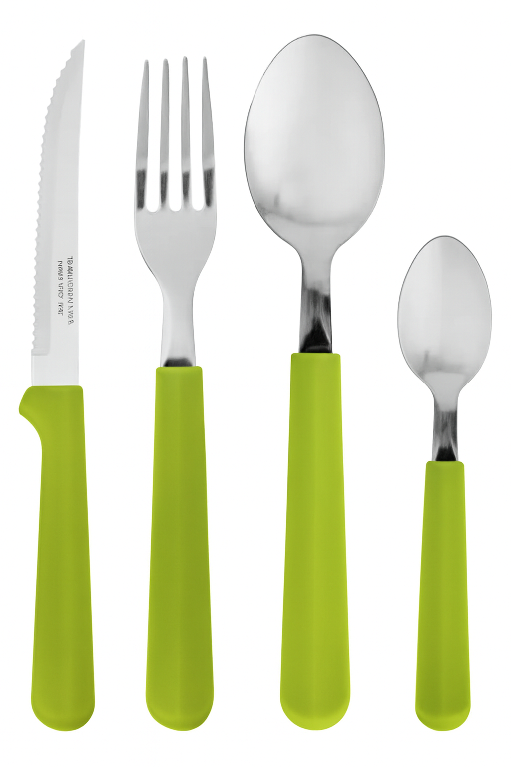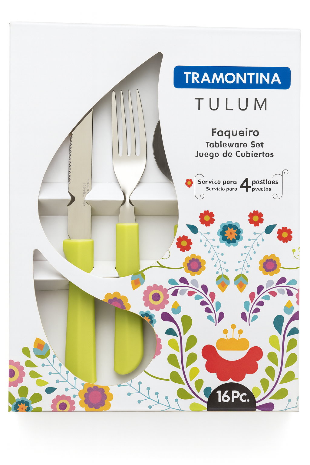 Lâminas de aço inox. As lâminas das facas têm maior durabilidade do fio devido ao tratamento térmico. Os garfos e colheres garantem maior resistência devido a espessura do aço e a estampagem das lâminas. Os cabos de polipropileno possuem maior resistência e durabilidade. Podem ir à máquina de lavar louças facilitando seu dia a dia.