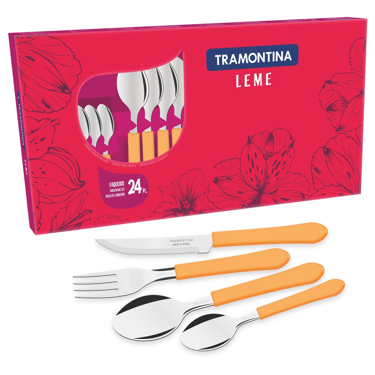 Leve à mesa a alegria das cores. Os talheres da linha Leme tem cabos coloridos e resistentes de polipropileno. Com lâminas em aço inox, a facas, o garfos e as colheres têm alta resistência e durabilidade. As lâminas das facas recebem tratamento térmico que lhes garante vida longa ao fio. Todas as peças podem ir à máquina de lavar.