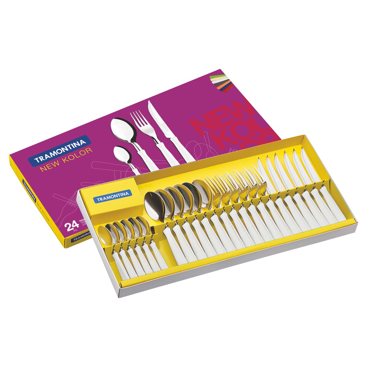 Leve à mesa a alegria das cores. Os talheres da linha New Kolor tem cabos coloridos e resistentes de polipropileno. Com lâminas em aço inox, a facas, o garfos e as colheres têm alta resistência e durabilidade. As lâminas das facas recebem tratamento térmico que lhes garante vida longa ao fio. Todas as peças podem ir à máquina de lavar.