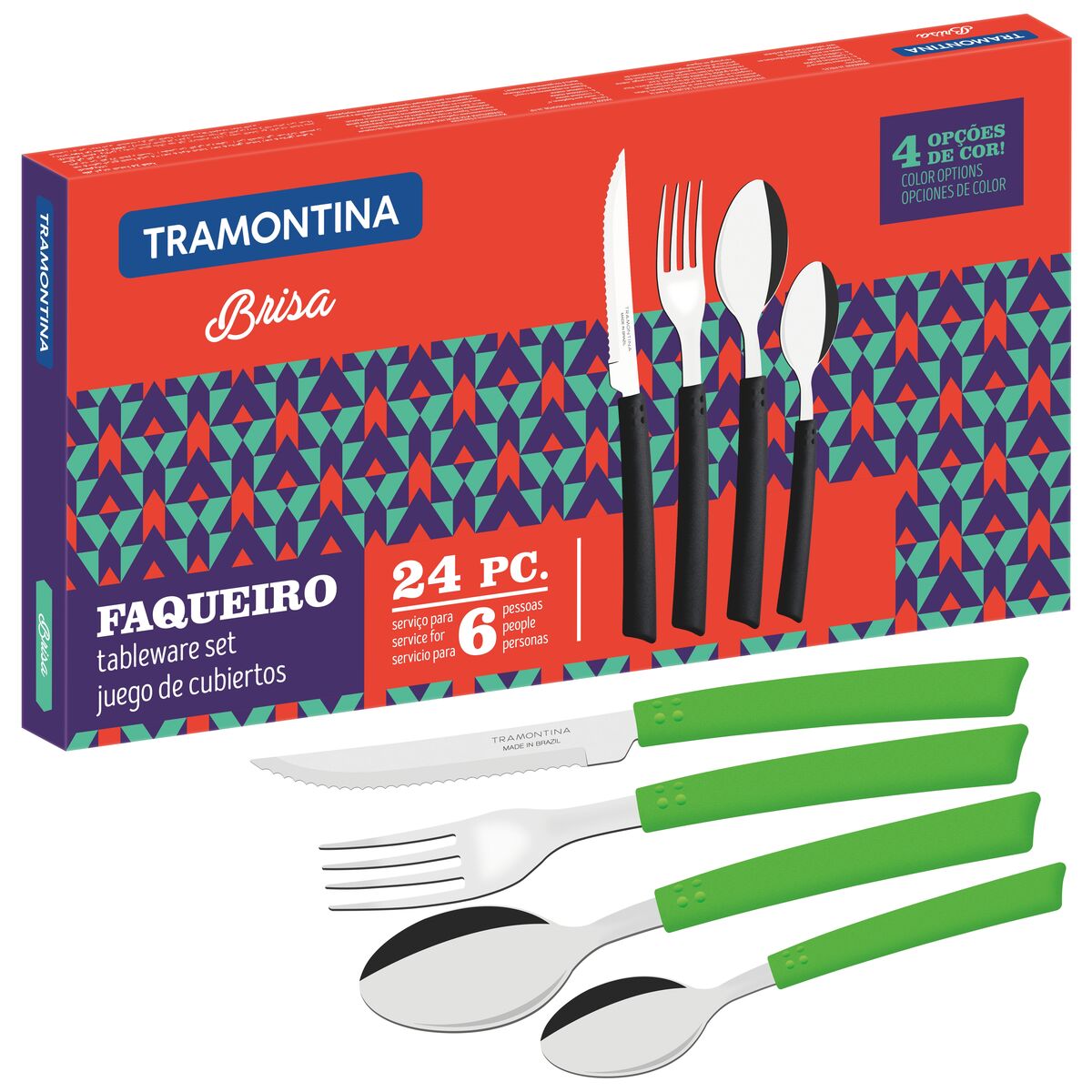 Leve à mesa a alegria das cores. Os talheres da linha Brisa tem cabos coloridos e resistentes de polipropileno. Com lâminas em aço inox, a facas, o garfos e as colheres têm alta resistência e durabilidade. As lâminas das facas recebem tratamento térmico que lhes garante vida longa ao fio. Todas as peças podem ir à máquina de lavar.