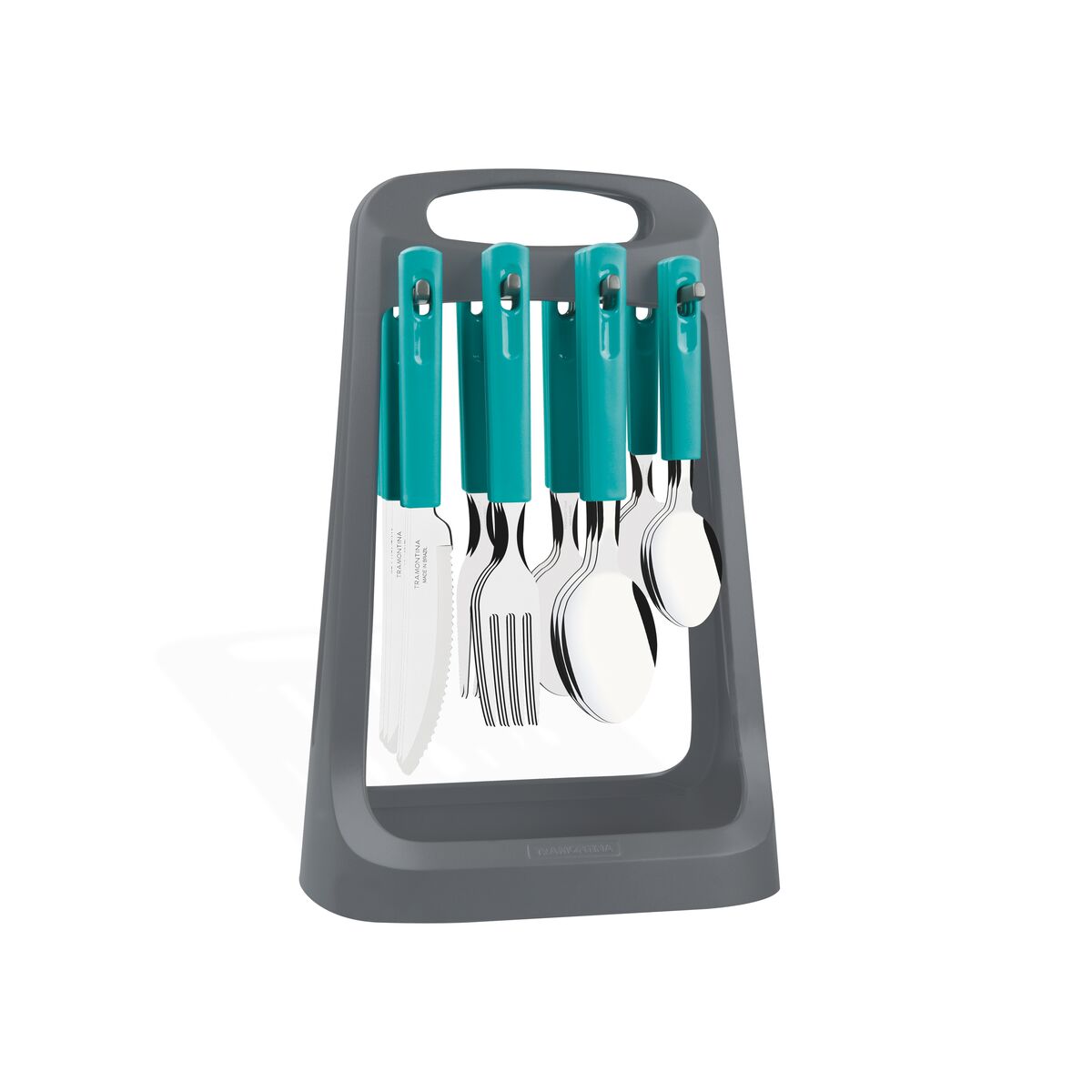 Faqueiro Tramontina Oasis com Lâminas em Aço Inox e Cabos de Polipropileno com Suporte Turquesa 25 Peças