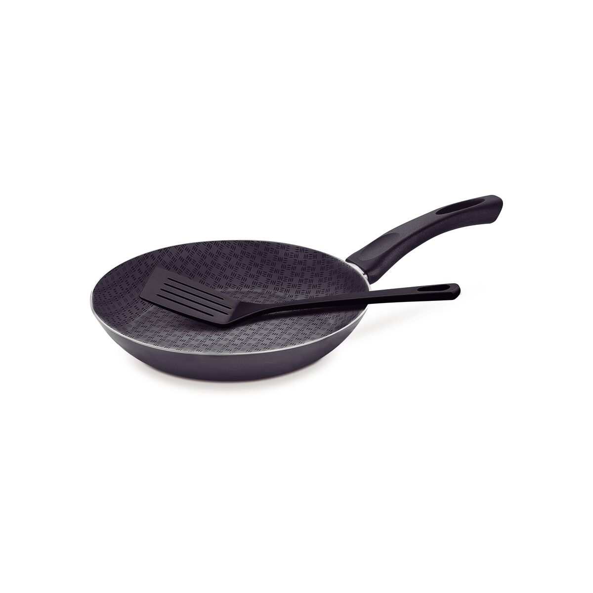 Alumínio com revestimento interno e externo de antiaderente Starflon T1. Cabo de baquelite antitérmico. Espátula de nylon.
