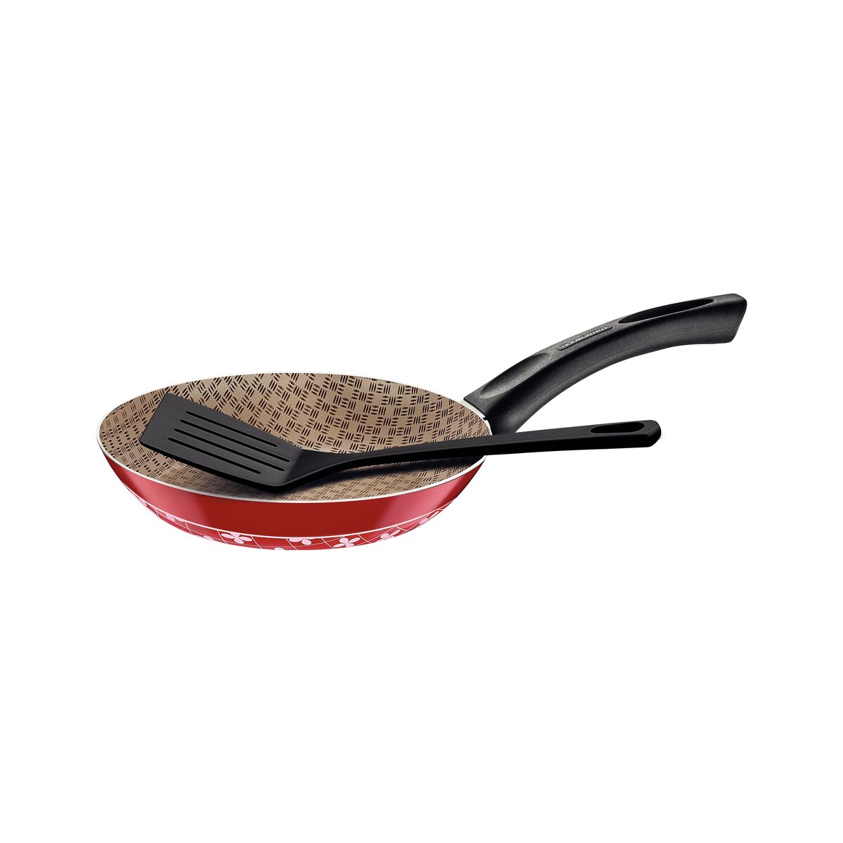 Alumínio com revestimento interno de antiaderente Starflon T1 e externo de silicone. Cabo de baquelite antitérmico. Espátula de nylon.