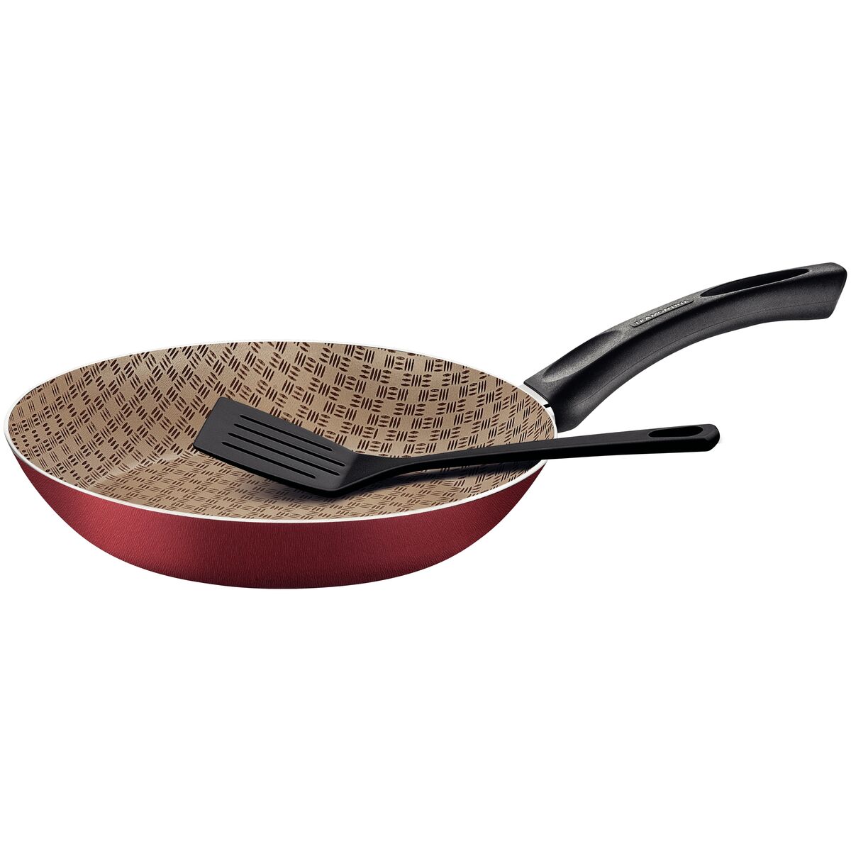 Alumínio com revestimento interno e externo de antiaderente Starflon T1. Cabo de baquelite antitérmico. Espátula de nylon.