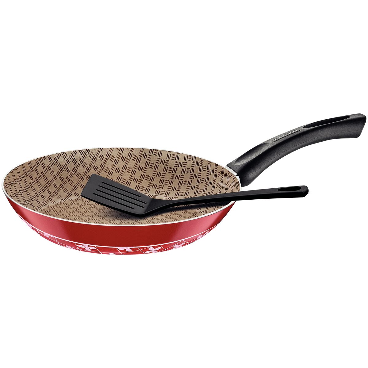 Alumínio com revestimento interno de antiaderente Starflon T1 e externo de silicone. Cabo de baquelite antitérmico. Espátula de nylon.